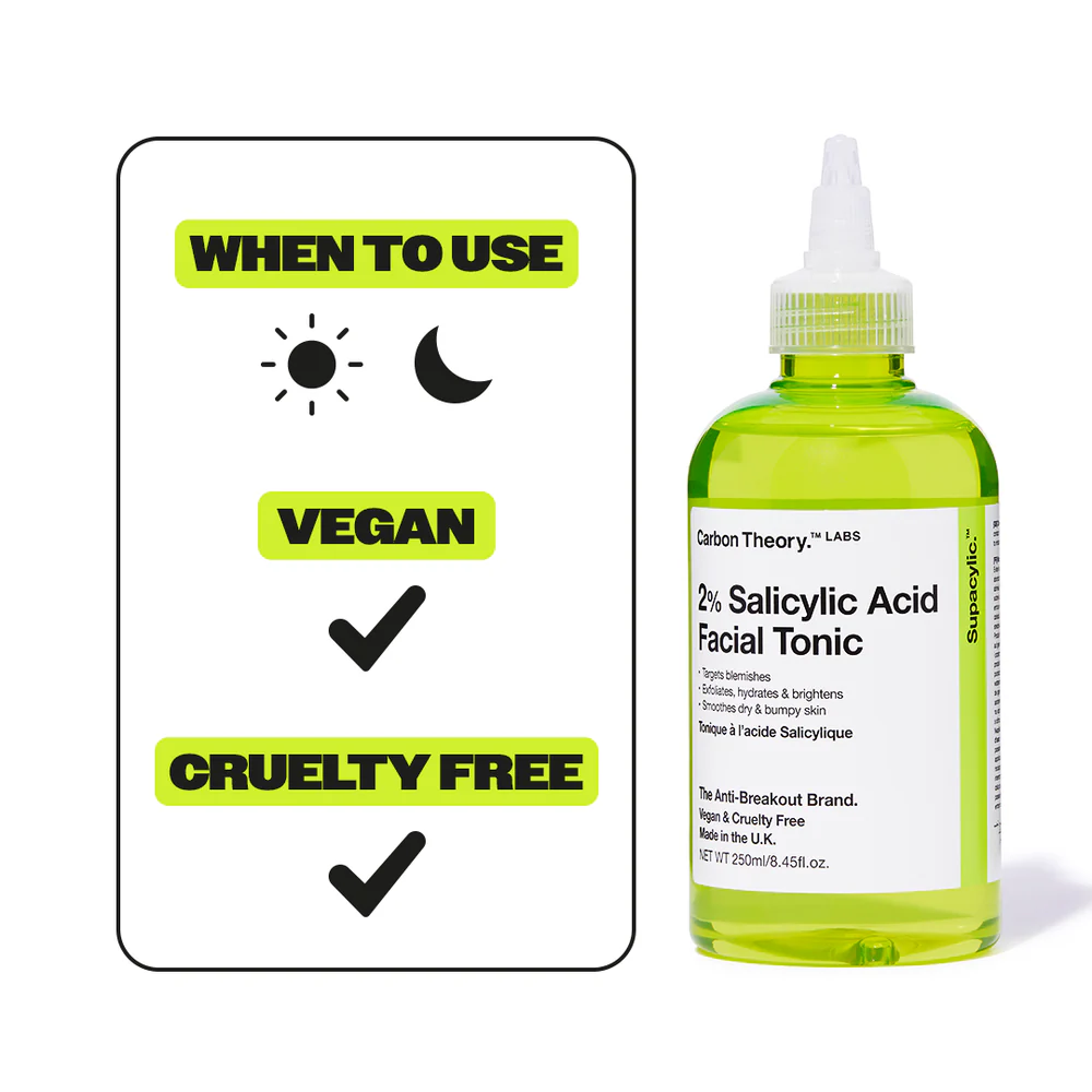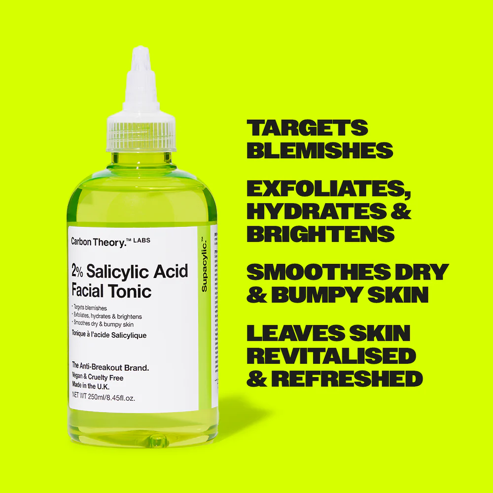 Carbon Theory Supacylic 2% Tonic is a targeted exfoliating toner designed to help manage acne and congested pores. Formulated with 2% exfoliating acid, it works to remove dead skin cells, reduce excess oil, and help prevent breakouts and blackheads.