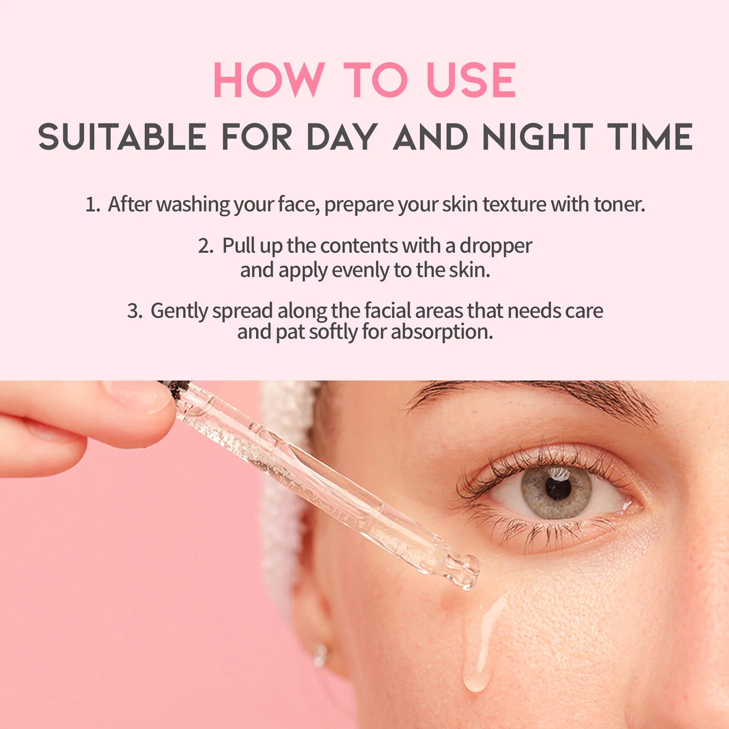 After cleansing and toning, dispense an appropriate amount of serum using the dropper.