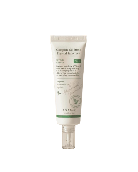 AXIS-Y Complete No-Stress Physical Sunscreen SPF 50+ PA++++ (Ver. 3) is a lightweight mineral sunscreen that protects against UVA & UVB rays while soothing and nourishing the skin. Infused with Mugwort, 2% Niacinamide, and Squalane, it delivers high sun protection without irritation or heaviness.