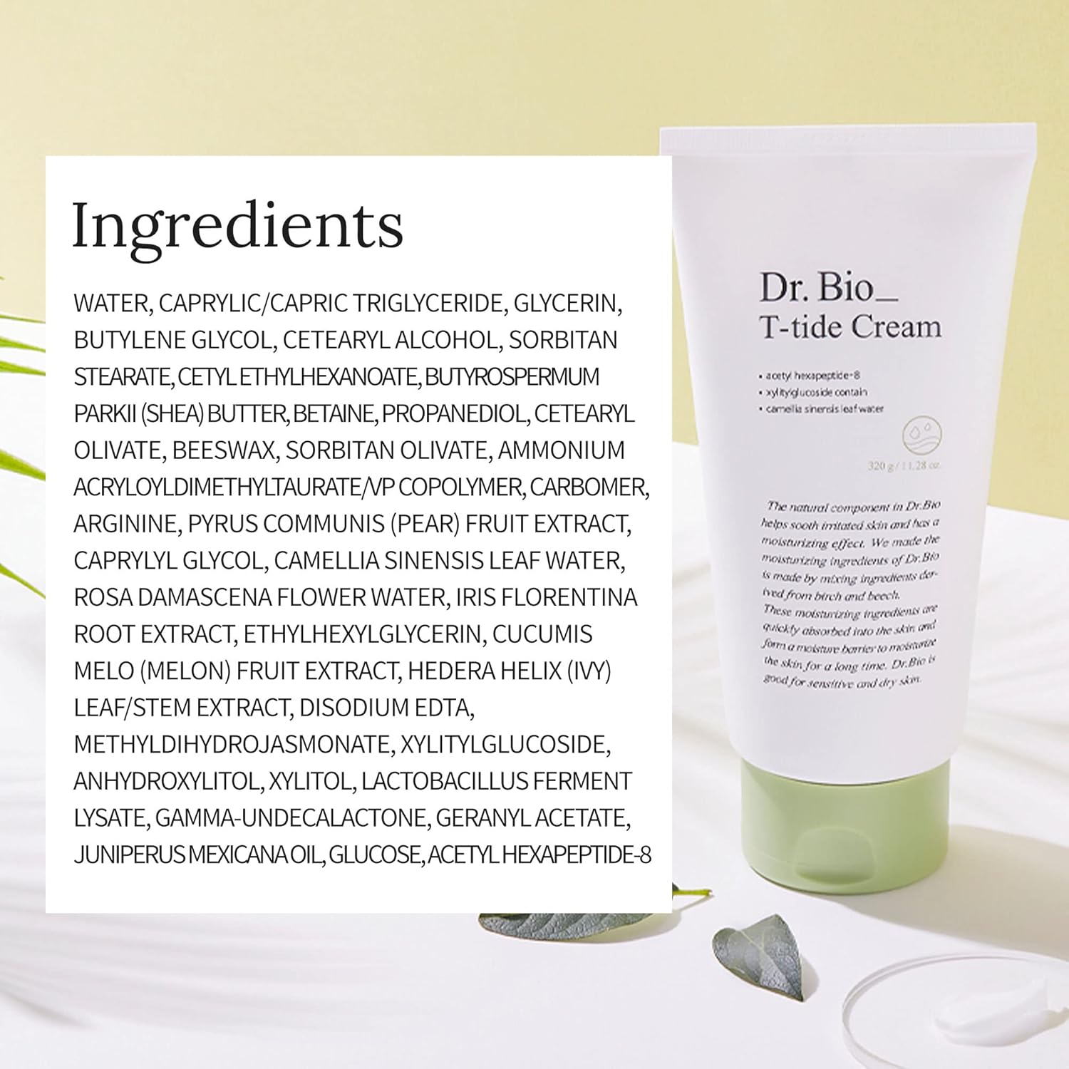 Experience advanced Korean derma-cosmetic care with Dr. Bio T-tide Cream. This versatile, large-capacity moisturizer is engineered to address extreme dryness and sensitivity from head to toe. Powered by a specialized T-Tide complex of peptides and green tea extract, it mimics the skin’s natural pH to provide a comfortable, non-irritating finish.