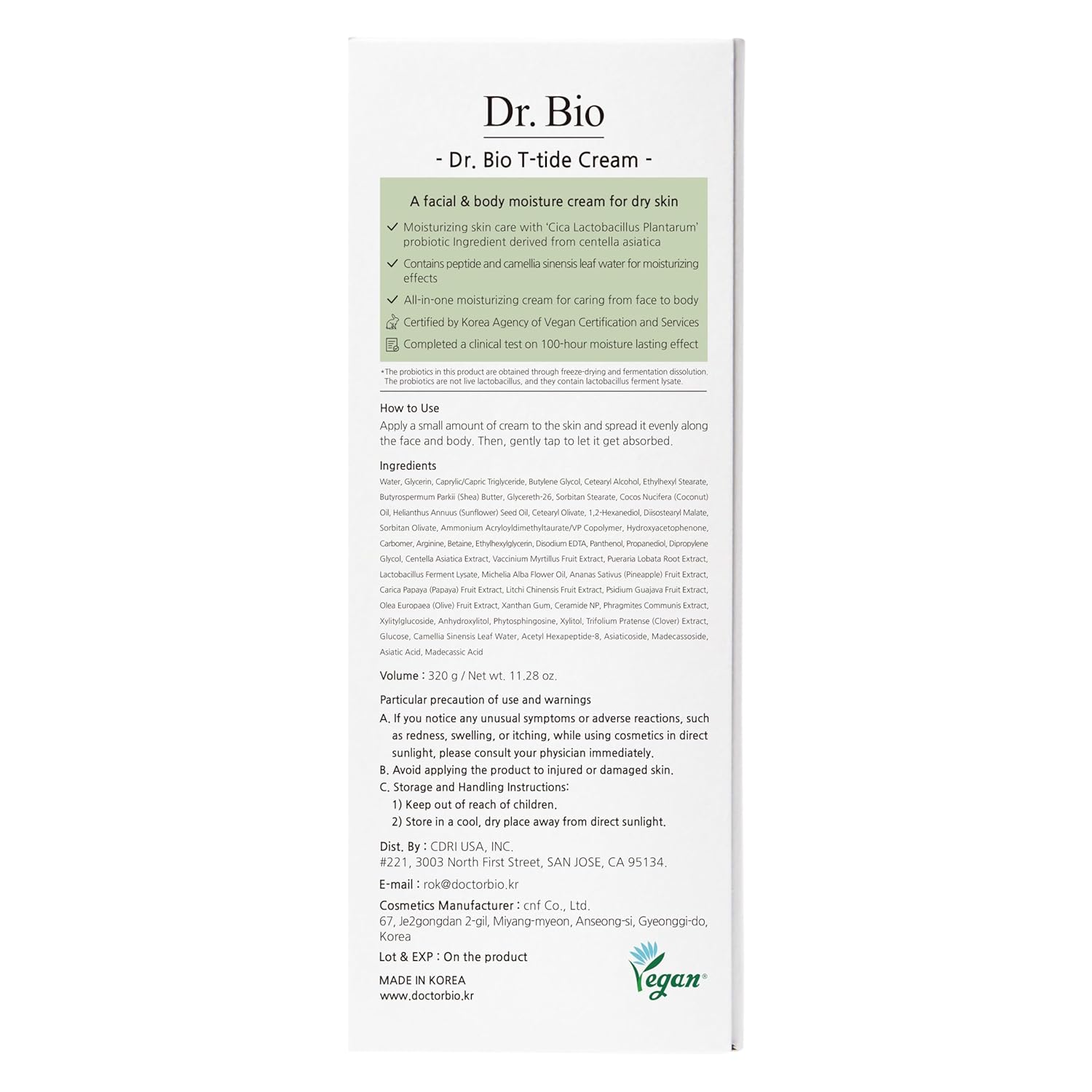 Dr. Bio T-tide Cream is a rich, all-in-one moisturizer for both face and body that provides long-lasting hydration for up to 100 hours. Infused with CICA and vegan probiotics, it strengthens the skin barrier and soothes irritation. This hypoallergenic and EWG Green Level certified formula is safe for the whole family, including newborns.