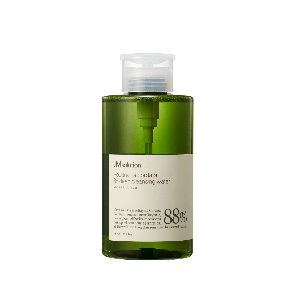 Experience a gentle yet thorough cleanse with the JMsolution Houttuynia Cordata 88 Deep Cleansing Water. Formulated with a mild acidic profile, this high-capacity cleanser is designed to effectively remove makeup and daily impurities without causing irritation. Infused with 88% Houttuynia Cordata (Heartleaf) Leaf Water, it provides a deep, soothing clean that calms skin sensitized by external environmental factors.