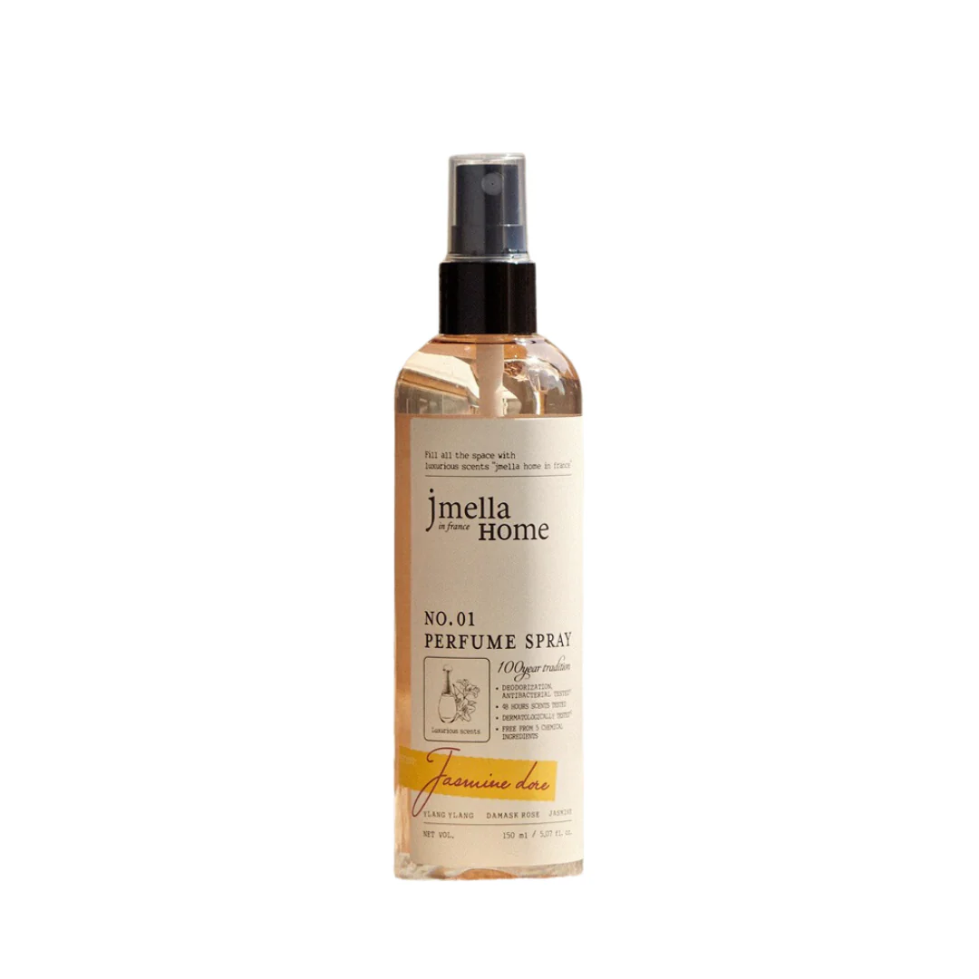 Refresh your space with Jmella Home No. 01 Jasmine Dore Perfume Spray. This luxurious room spray combines the elegance of Ylang Ylang, Damask Rose, and Jasmine for a captivating floral scent. Tested for 48-hour scent longevity and antibacterial deodorization, it’s a safe, dermatologically tested formula free from harsh chemicals. Perfect for instant freshness on fabrics or in any room.