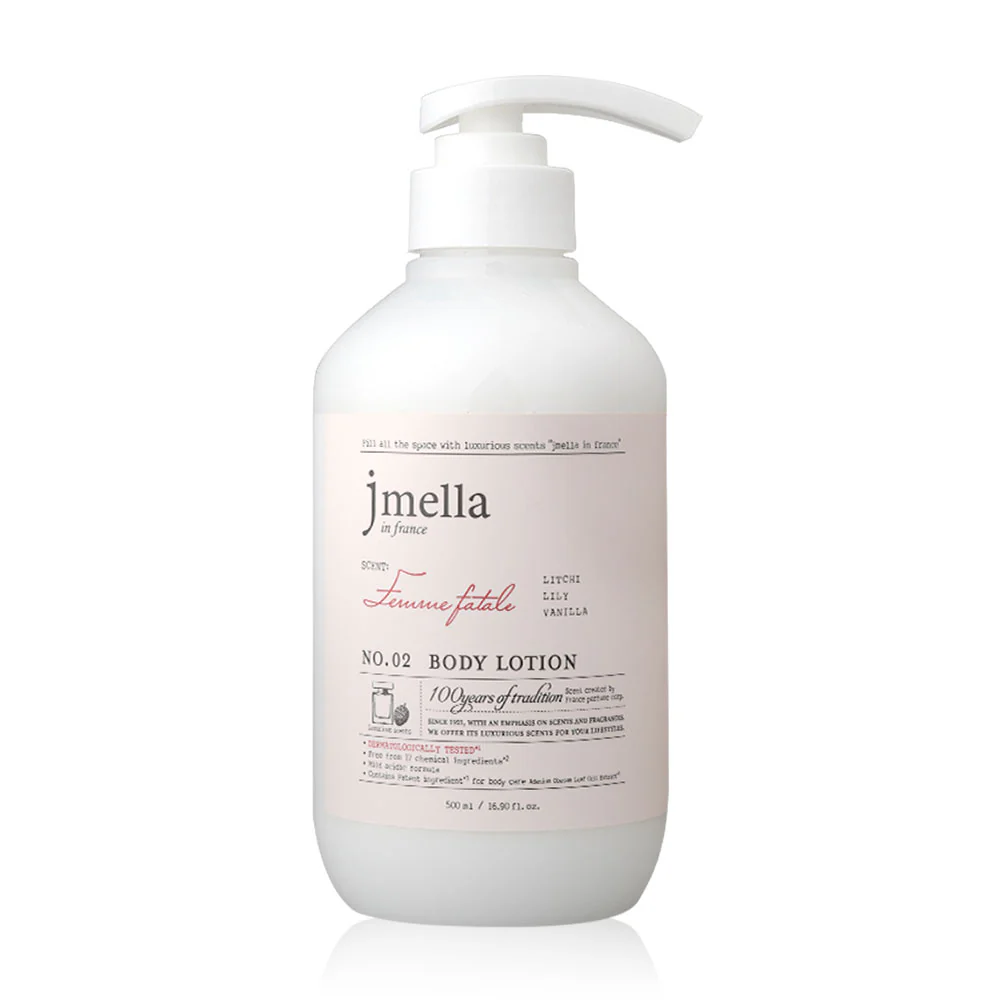Captivate your senses with the Jmella No. 02 Femme Fatale Body Lotion. This luxurious moisturizer features a seductive French fragrance of Litchi, Lily, and Vanilla. Formulated with a mild acidic pH and free from 17 harmful chemical ingredients, it provides deep hydration and 24-hour fragrance for soft, healthy skin. Perfect for a long-lasting, elegant scent experience.