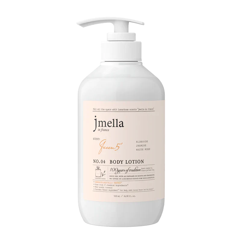 Embrace timeless elegance with Jmella No. 04 Queen 5 Body Lotion. Featuring a classic French fragrance blend of Aldehyde, Jasmine, and White Musk, this luxury moisturizer provides 24-hour hydration. Formulated with a mild acidic pH and free from 17 harmful chemicals, it leaves your skin feeling silky-smooth and regally scented.