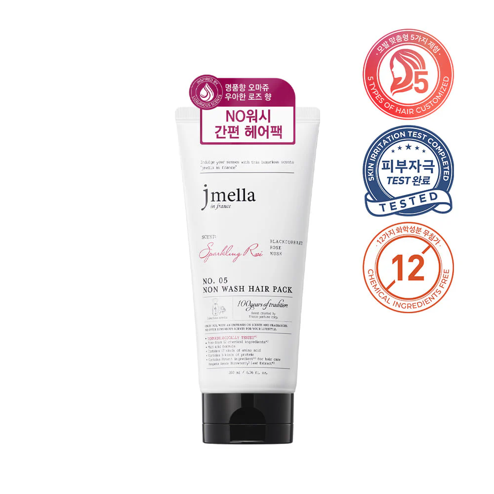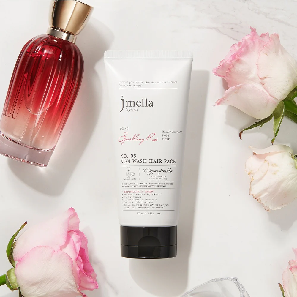 Repair and refresh your hair instantly with the Jmella No. 05 Sparkling Rose Non-Wash Hair Pack. This luxurious leave-in treatment features a vibrant French perfume blend of Blackcurrant, Rose, and Musk. Formulated with 17 types of amino acids and 6 types of protein, it provides intensive nourishment and brilliant shine without the need for rinsing.