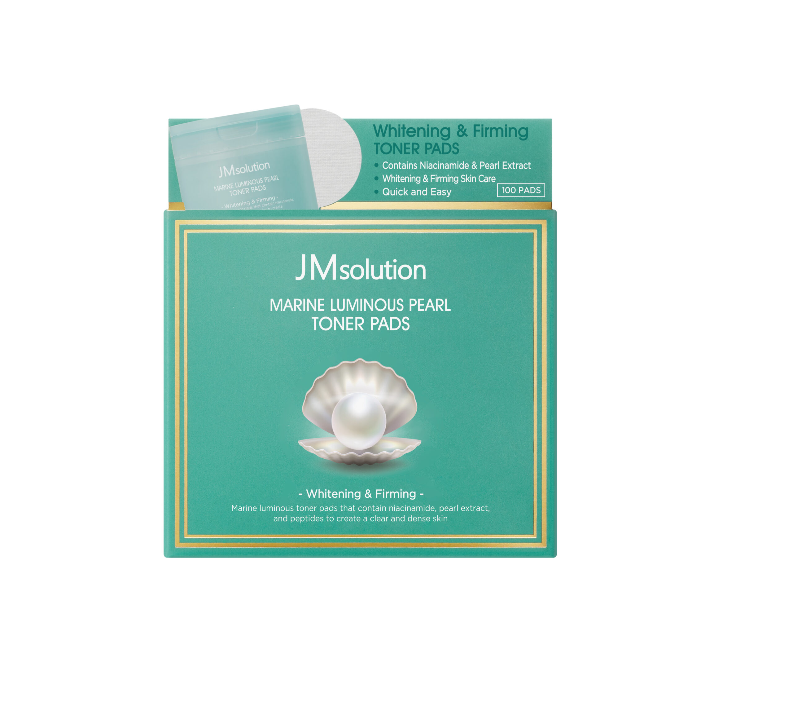JMsolution Marine Luminous Pearl Toner Pads for instant whitening and firming. Infused with Niacinamide and Pearl Extract to brighten dull skin and improve elasticity. The ultimate 2-in-1 prep step for a translucent, glass-skin glow. Available now in Kuwait.