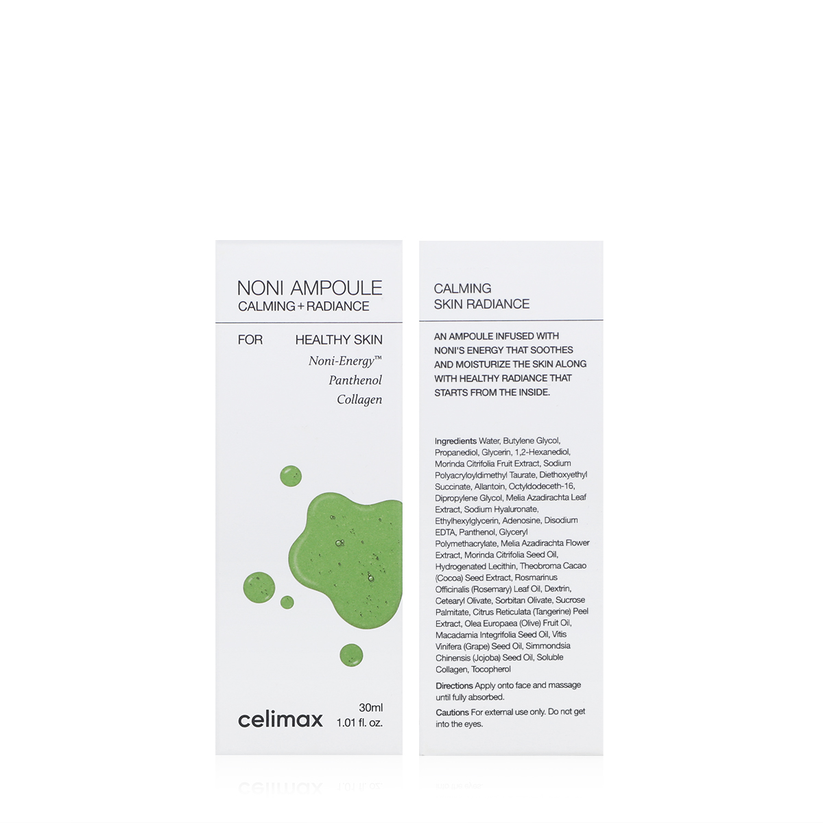 Celimax Noni Ampoule Calming + Radiance is a soothing facial serum enriched with Noni Energy™, Panthenol, and Collagen to calm irritated skin, restore moisture, and boost natural glow for healthy, radiant skin.