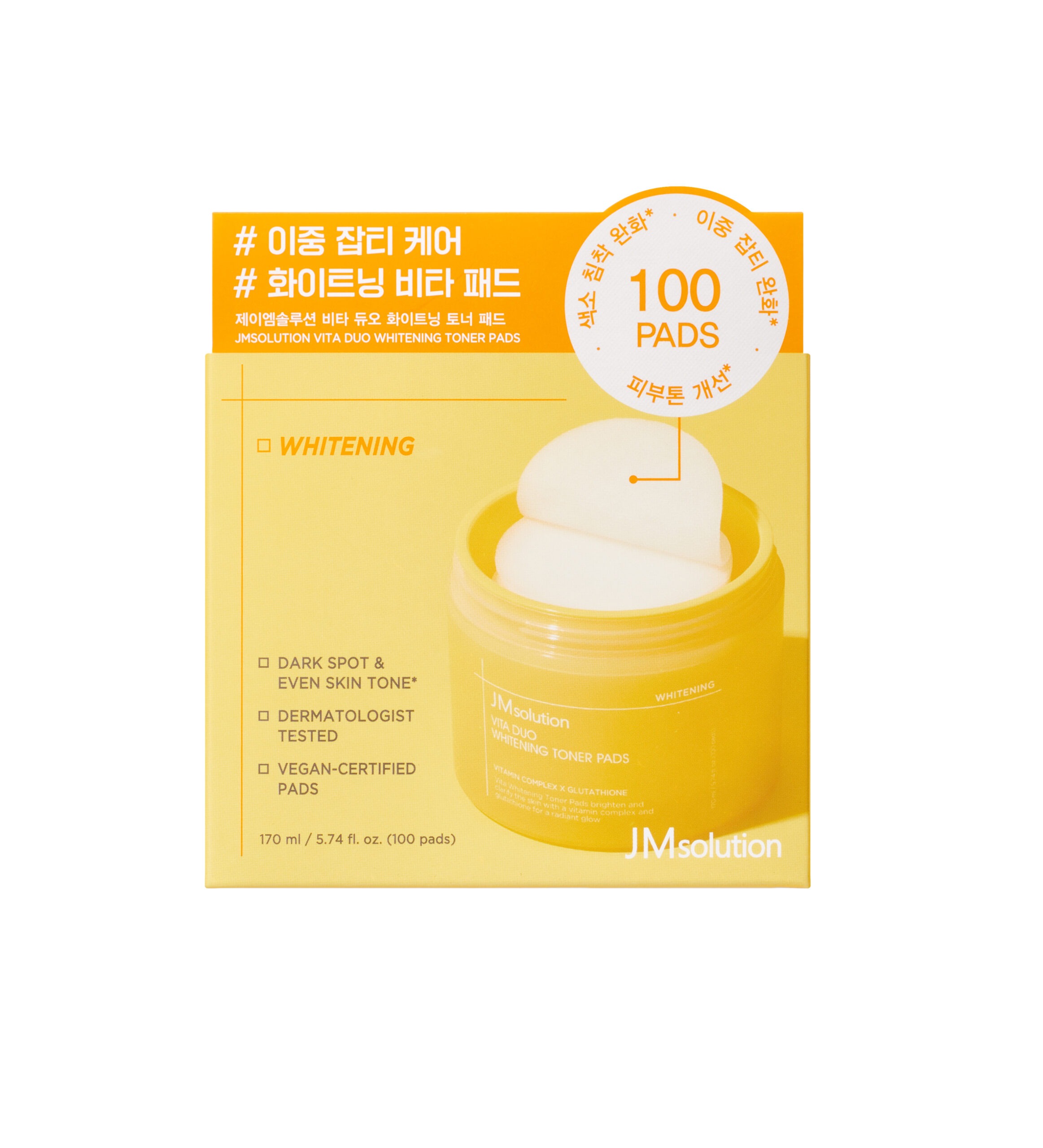 JMsolution Vita Duo Whitening Toner Pads (100 Pads / 170ml) Professional-grade toner pads designed to brighten and clarify the skin through a potent blend of Vitamin Complex and Glutathione. These dual-action pads provide immediate hydration while targeting dark spots and uneven skin tone. Perfect for daily use, they leave the complexion with a radiant, healthy glow and a smooth, refined texture.
